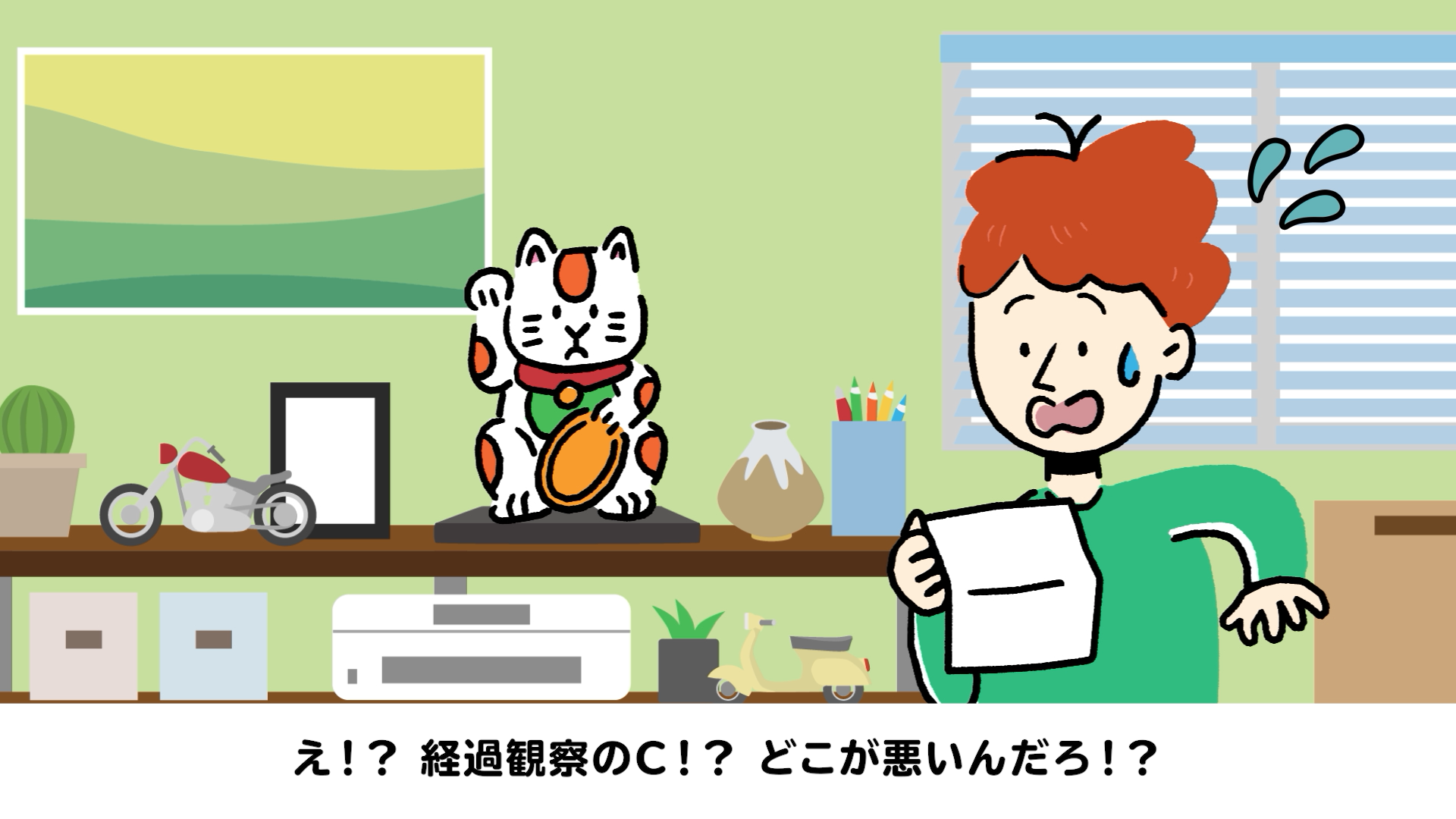 健康診断結果が届き、中身を見るとそこには「経過観察」のCが…。「すぐに病気になるわけではないから保険の検討はもっと先になってから考えればいい」と油断している主人公。すると突然、目の前の招き猫が「健康診断結果によっては加入できない可能性があり、今回の診断結果によっても入れない可能性がある」と語り始めます。